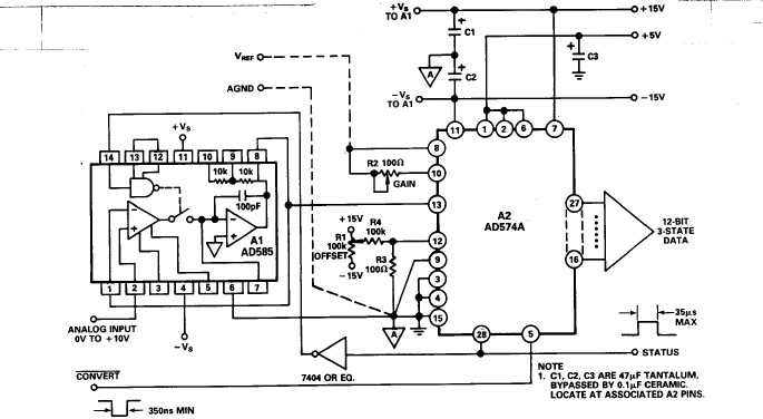 此電路使用一個AD585 S/H,在同相單位增益模式下連接,保持激活。該模數(shù)轉(zhuǎn)換器為AD574A,連接用于實現(xiàn)單極0至+ 10V范圍,其系統(tǒng)增益和偏置校準分別由R2和R1設置。AD574的狀態(tài)輸出驅(qū)動AD585 A1的輸入,以實現(xiàn)盡可能低的S/H偏移。這需要在TTL級中進行反轉(zhuǎn)。