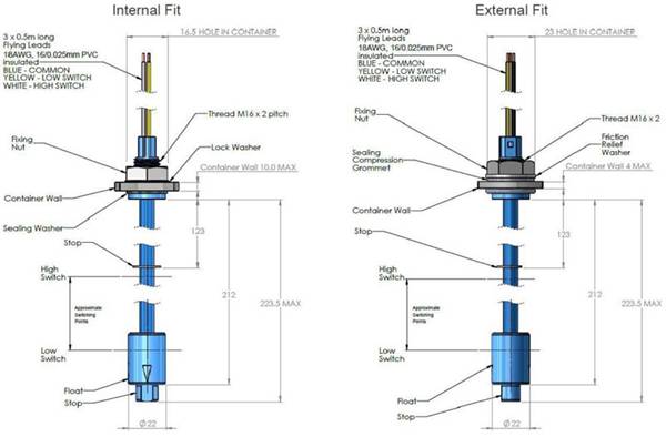 · LCS-03,外殼為乙縮醛/聚丙烯,浮子為發(fā)泡聚丙烯。這是為在空間有限的水和廢水應(yīng)用中使用而設(shè)計(jì)的。它有一個(gè)緊湊的水平短擺 (35.5 mm),并配有電纜或一體式連接器。當(dāng)浮子處于水平狀態(tài)時(shí),它是 N.C.,額定電壓為 48 伏直流,最大功率為 40 瓦。