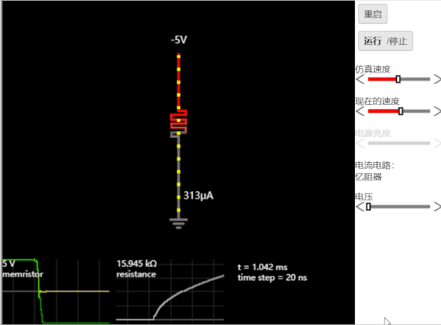 此示例顯示了憶阻器。它充當(dāng)電阻器,但是電阻會(huì)隨著時(shí)間的流逝而變化。在此示例中,使用右側(cè)的滑塊選擇輸入電壓。憶阻器起初具有高電阻,但是電流導(dǎo)致該電阻隨時(shí)間降低,直到達(dá)到最小值。如果將輸入電壓設(shè)置為負(fù)值,則電阻將逐漸增加,直到達(dá)到最大值。憶阻器的電壓,電流和電阻的圖形顯示在電路下方。