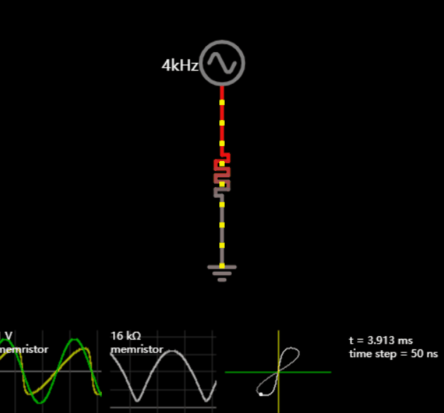 此示例顯示了憶阻器對正弦波的響應(yīng)。電路下方的圖形顯示了憶阻器的電壓(綠色),電流(黃色)和電阻(白色)。還顯示了電壓與電流的關(guān)系圖。請注意,電壓與電流具有非線性關(guān)系。
